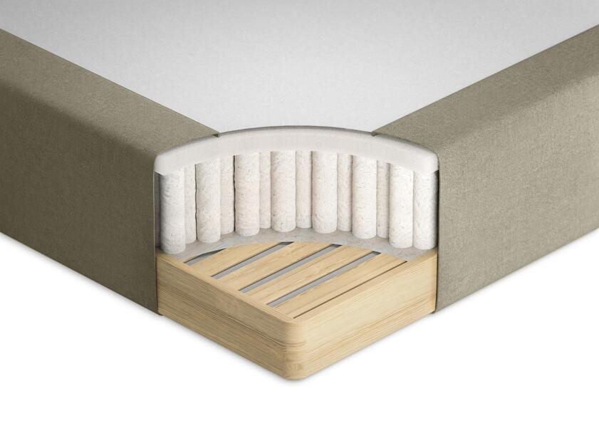 Ramsängens stoppning av polyeter stabiliserar fjädrarna och skapar ett kontrollerat grundlager. Ramen är tillverkad av gran och furu med en höjd på cirka 12 cm, vilket ger en robust bas för hela konstruktionen. Elegans kan kombineras med valfri bäddmadrass för att justera komfortnivån ytterligare.